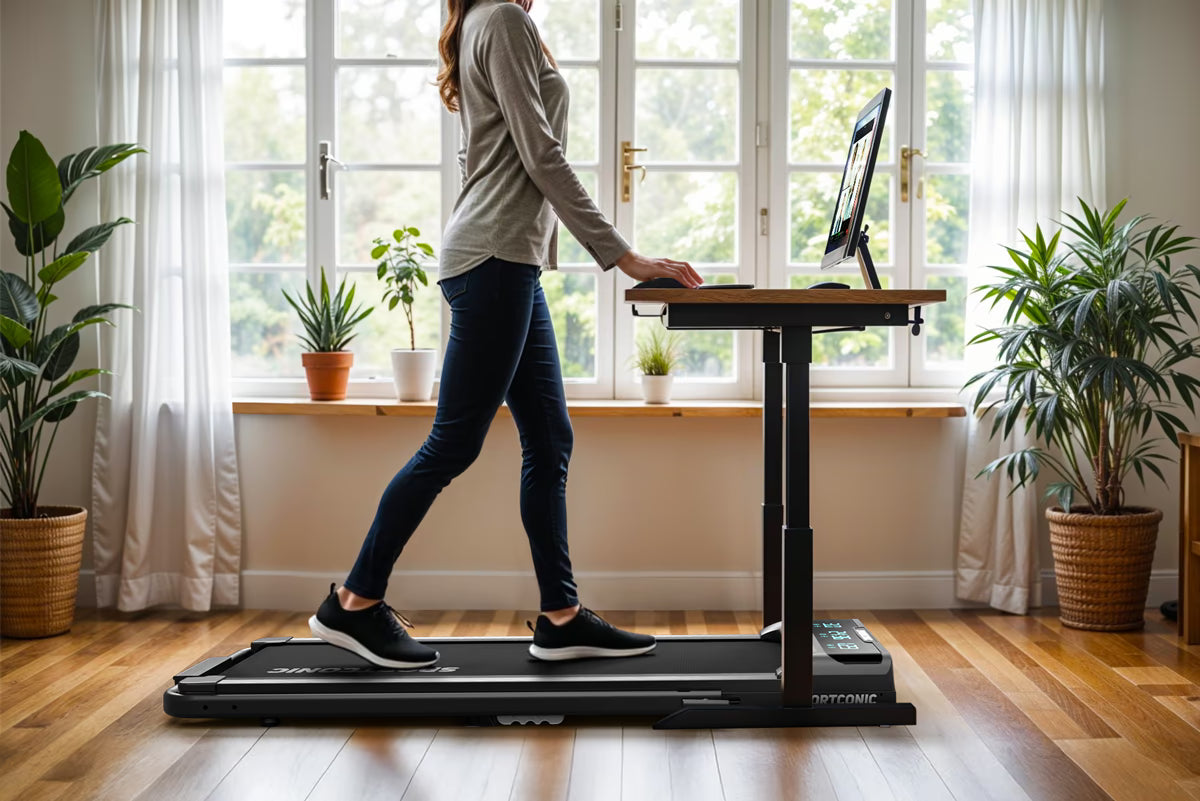 Wechseln Sie mühelos zwischen sitzender Tätigkeit und aktivem Gehen, ohne Ihren Rhythmus zu unterbrechen. Das Laufband passt perfekt unter einen Steh-Sitz-Schreibtisch und ermöglicht es Ihnen, zu gehen, während Sie arbeiten, konferieren oder telefonieren.