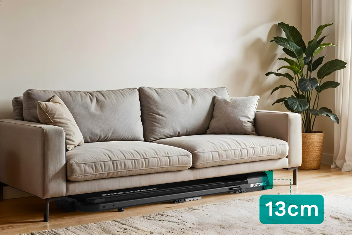 Dank seines intelligenten, kompakten Designs ist das Laufband ideal für den Heimgebrauch. Mit einer eingeklappten Höhe von nur 13 Zentimetern schieben Sie es mühelos unter Sofa, Bett oder Schrank. Die integrierten Rollen machen das Verschieben auch in kleineren Räumen zum Kinderspiel.